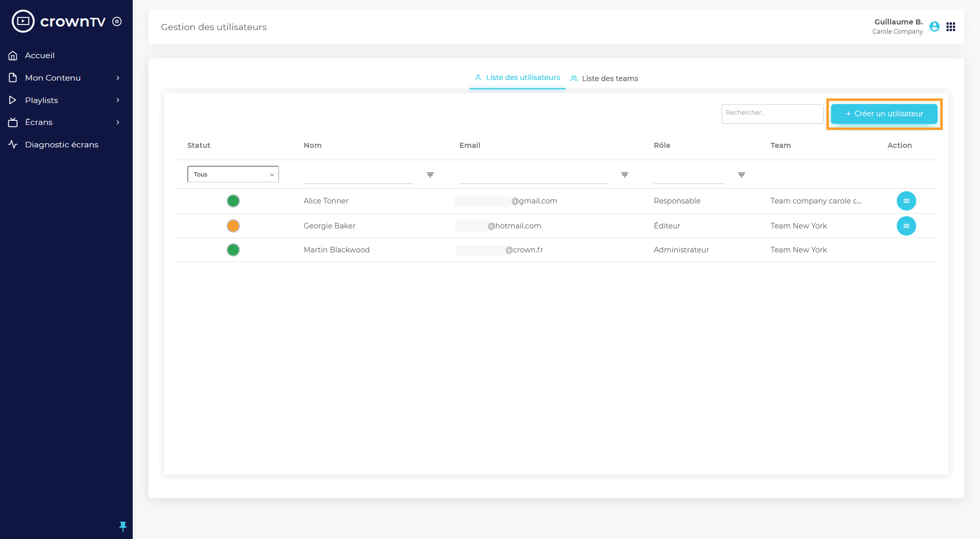 Sur cette page, vous pouvez voir la liste de tous les utilisateurs qui ont accès à votre interface (ainsi que leur rôle et à la team à laquelle ils appartiennent).