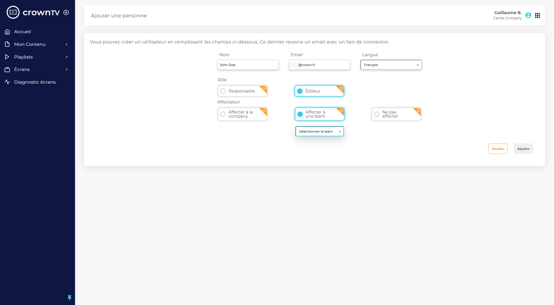 Si vous choisissez d’assigner l’utilisateur à une team, un menu déroulant contenant la liste des teams existantes apparaîtra.