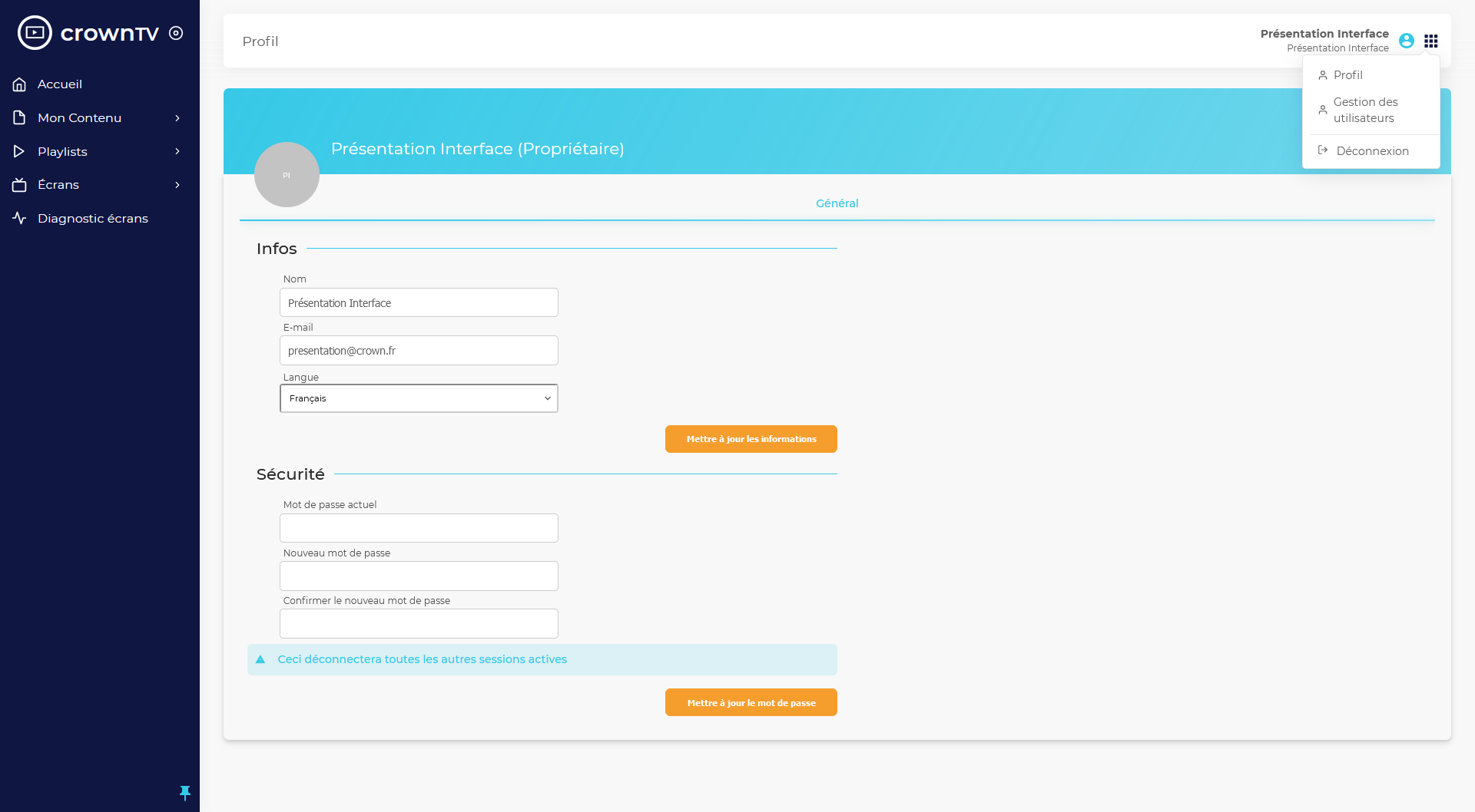 Sur cette page, vous pouvez éditer votre nom, votre adresse email ainsi que la langue d’affichage de votre interface.